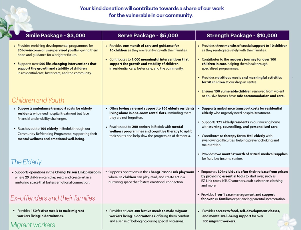 Throughout the years, we have established a comprehensive network of social services to meet a wide range of needs in our community. Our diverse programmes reach out to vulnerable children and youth, frail elderly, struggling families, isolated migrant workers, and other needy segments in our society. For more information about the work we do, please visit our website at